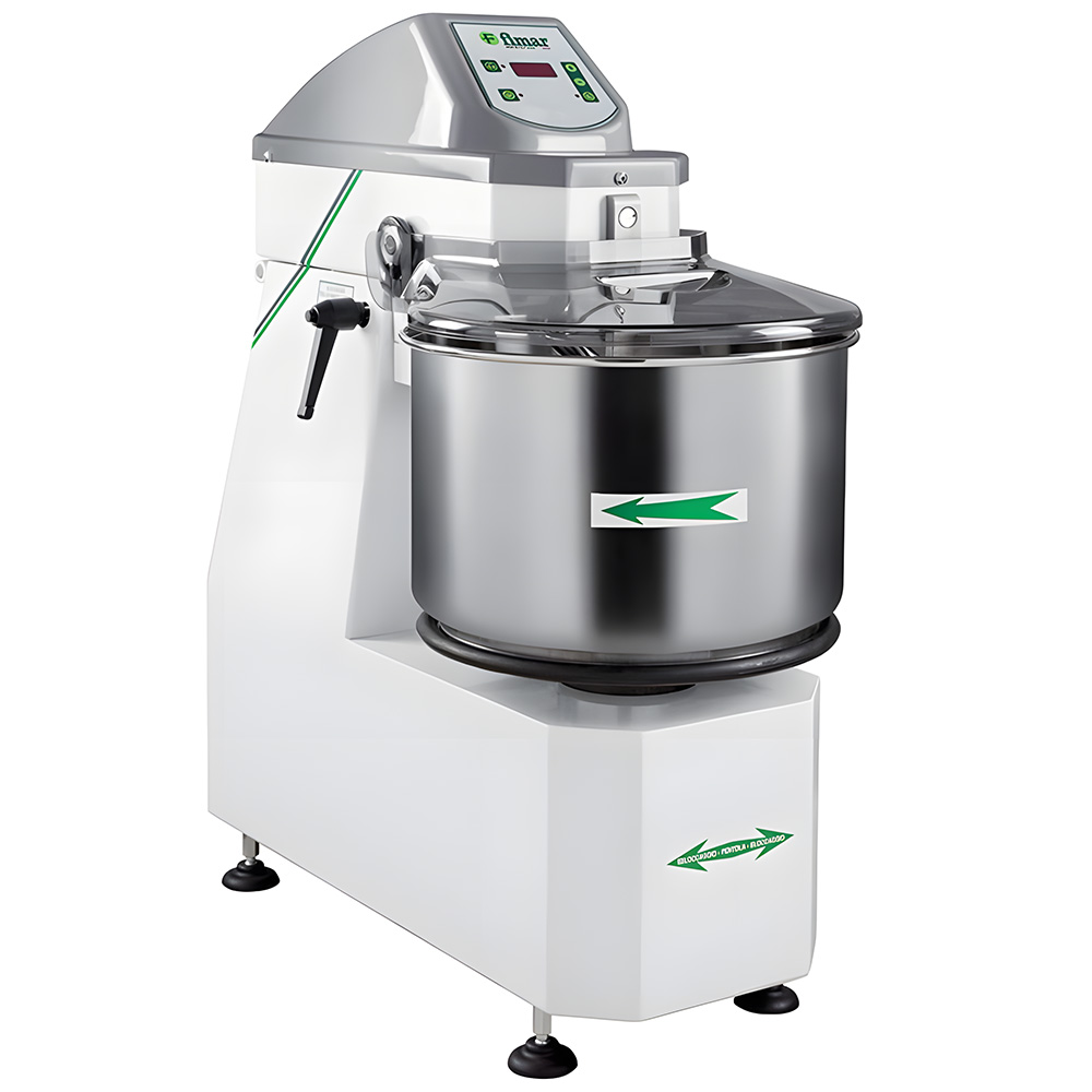 - Подъёмная траверса с месильным органом: Позволяет легко поднимать и фиксировать спираль для доступа к деже, что облегчает обслуживание и гигиеническую обработку оборудования.