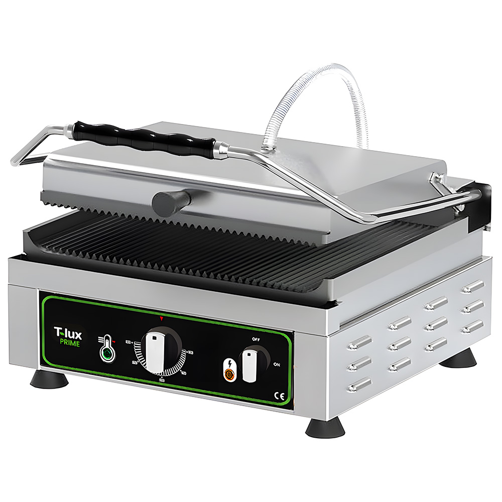 Контактный гриль T-Lux PRIME CG 2735 RR — это профессиональное и надежное оборудование для приготовления разнообразных блюд в заведениях быстрого обслуживания, ресторанах, кафе и бургерных. Гриль предназначен для быстрой и равномерной жарки мяса, птицы, рыбы, овощей, а также для приготовления идеальных гамбургеров и горячих сэндвичей. Модель сочетает в себе высокую производительность, простоту управления и безопасность эксплуатации, что делает ее незаменимым помощником на любой кухне. Прочный корпус из нержавеющей стали и массивные чугунные рабочие поверхности гарантируют долговечность и отличные результаты приготовления.
