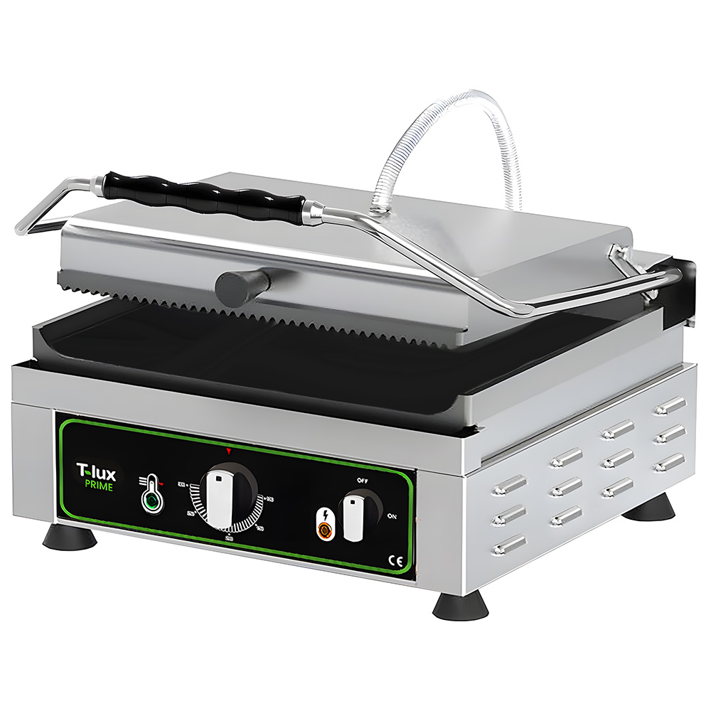 Контактный гриль T-Lux PRIME CG 2735 RS — это профессиональное и надежное оборудование для приготовления разнообразных блюд в заведениях быстрого обслуживания, ресторанах, кафе и бургерных. Гриль предназначен для быстрой и равномерной жарки мяса, птицы, рыбы, овощей, а также для приготовления идеальных гамбургеров и горячих сэндвичей. Модель сочетает в себе высокую производительность, простоту управления и безопасность эксплуатации, что делает ее незаменимым помощником на любой кухне. Прочный корпус из нержавеющей стали и массивные чугунные рабочие поверхности гарантируют долговечность и отличные результаты приготовления.