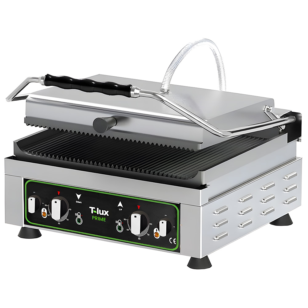 Контактный гриль T-Lux PRIME CG 2745 RR DT — это высокопроизводительное профессиональное оборудование, предназначенное для интенсивного использования в ресторанах, кафе, бургерных и на предприятиях фаст-фуда. Модель оснащена увеличенными рабочими поверхностями и уникальной функцией независимой регулировки температуры верхней и нижней плиты, что позволяет достигать идеального результата для каждого типа продукта. Гриль идеально подходит для жарки мяса, птицы, рыбы, овощей, а также для приготовления гамбургеров и горячих сэндвичей. Сочетание мощных чугунных пластин толщиной 15 мм и прецизионного терморегулятора гарантирует равномерную прожарку, аппетитную корочку и сохранение сочности блюд.