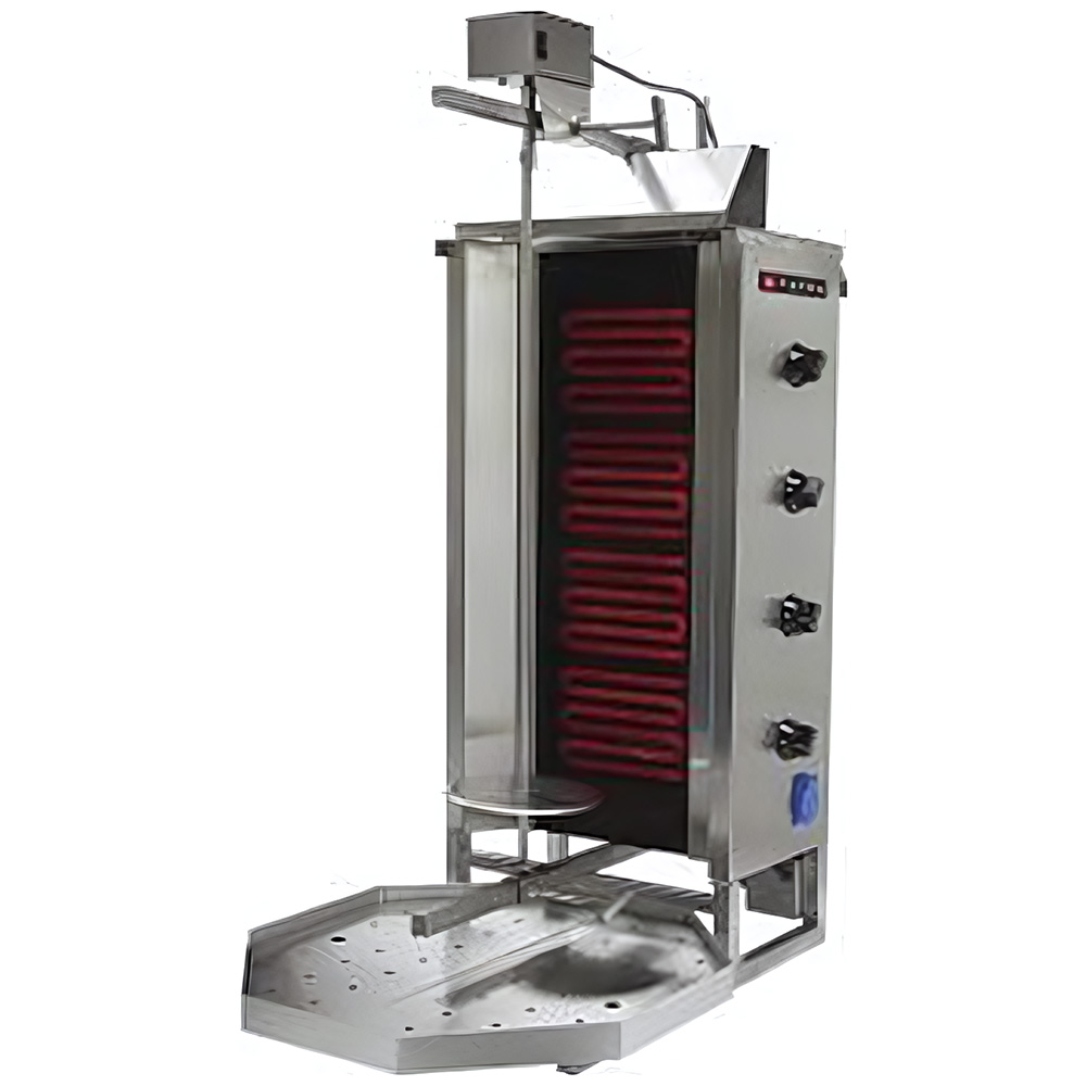 - Вертикальная система приготовления: Равномерное вращение мясной заготовки вокруг нагревательных элементов для идеальной прожарки
