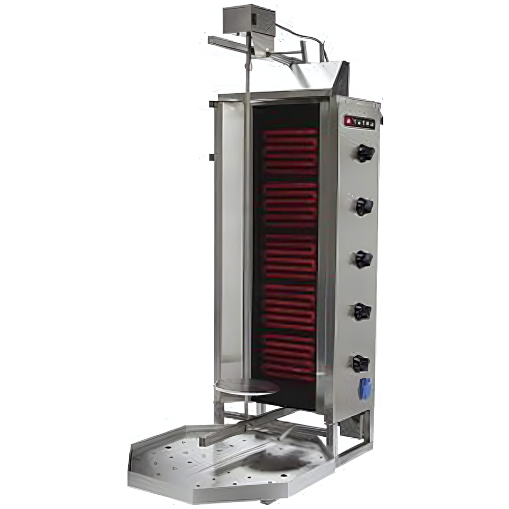 - Вертикальная система приготовления: Равномерное вращение мясной заготовки вокруг нагревательных элементов для идеальной прожарки