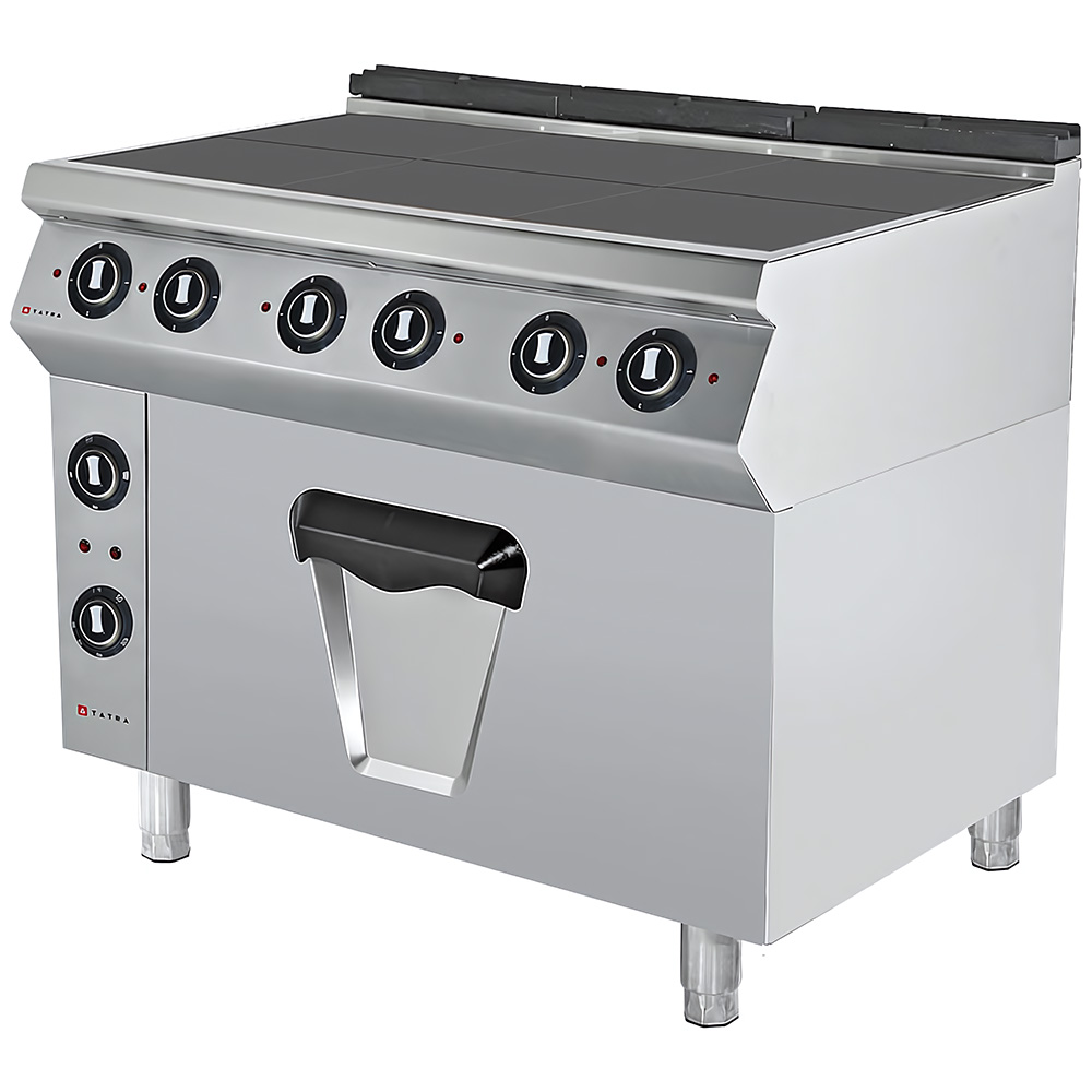Профессиональная электрическая плита Tatra TER.127OM серии 700 — это мощное и многофункциональное оборудование для предприятий общественного питания и торговли. Модель сочетает в себе высокопроизводительную варочную поверхность и вместительный жарочный шкаф, обеспечивая полный цикл приготовления различных блюд.