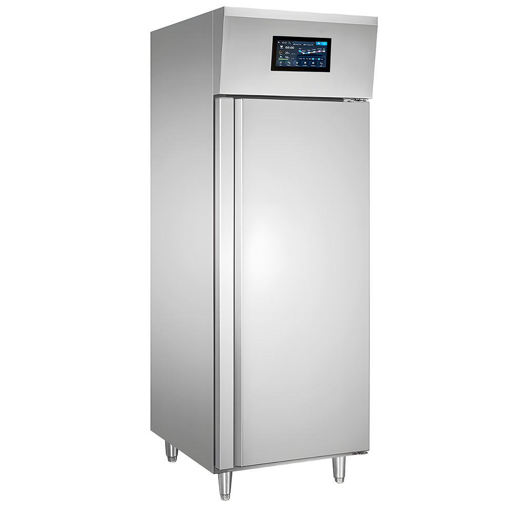 - Автоматический 4-шаговый цикл: В автоматическом режиме последовательно выполняются 4 этапа с индивидуальными настройками: шоковое замораживание (до -18 °C), охлаждение, предварительная и окончательная расстойка (до +50 °C). Каждый этап программируется по времени, температуре и влажности.