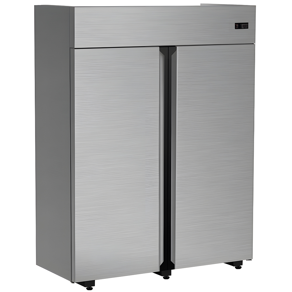- Удобство эксплуатации: Глухие распашные двери с внутренней LED-подсветкой облегчают доступ и контроль запасов. Верхнее расположение агрегата упрощает сервисное обслуживание.