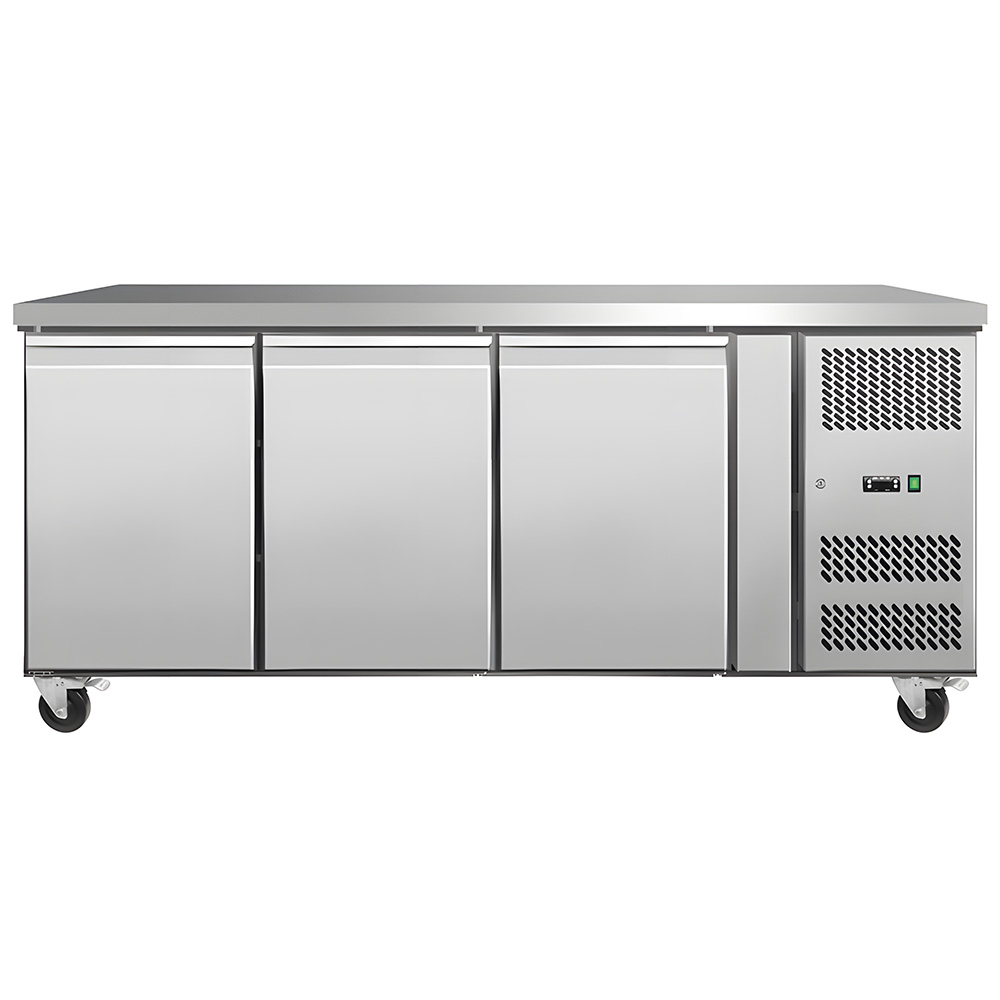 Стол холодильный Koreco GN/3100TN без борта — это профессиональное оборудование, предназначенное для обработки ингредиентов, приготовления блюд и кратковременного хранения скоропортящихся продуктов и напитков на предприятиях общественного питания и в торговых точках. Модель выполнена из нержавеющей стали AISI 201 и оснащена дверцами с магнитными уплотнителями, за которыми скрываются пластифицированные полки-решётки для гастроёмкостей стандарта GN 1/1.