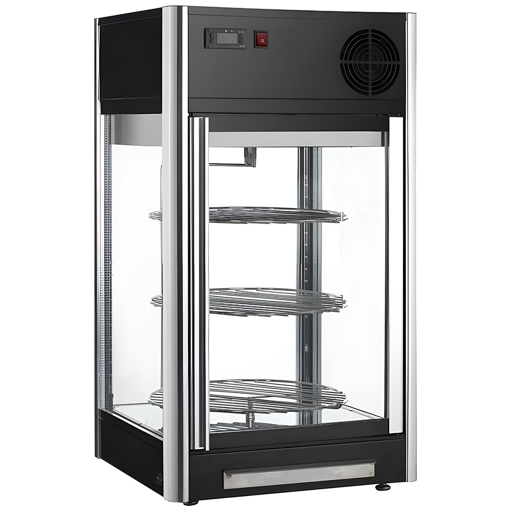 - Вращающиеся полки для максимальной презентации: Три круглые полки диаметром 360 мм вращаются, демонстрируя каждое изделие с лучшей стороны. Высота размещения полок регулируется с шагом 2 см, что позволяет адаптировать витрину под разные виды продукции.