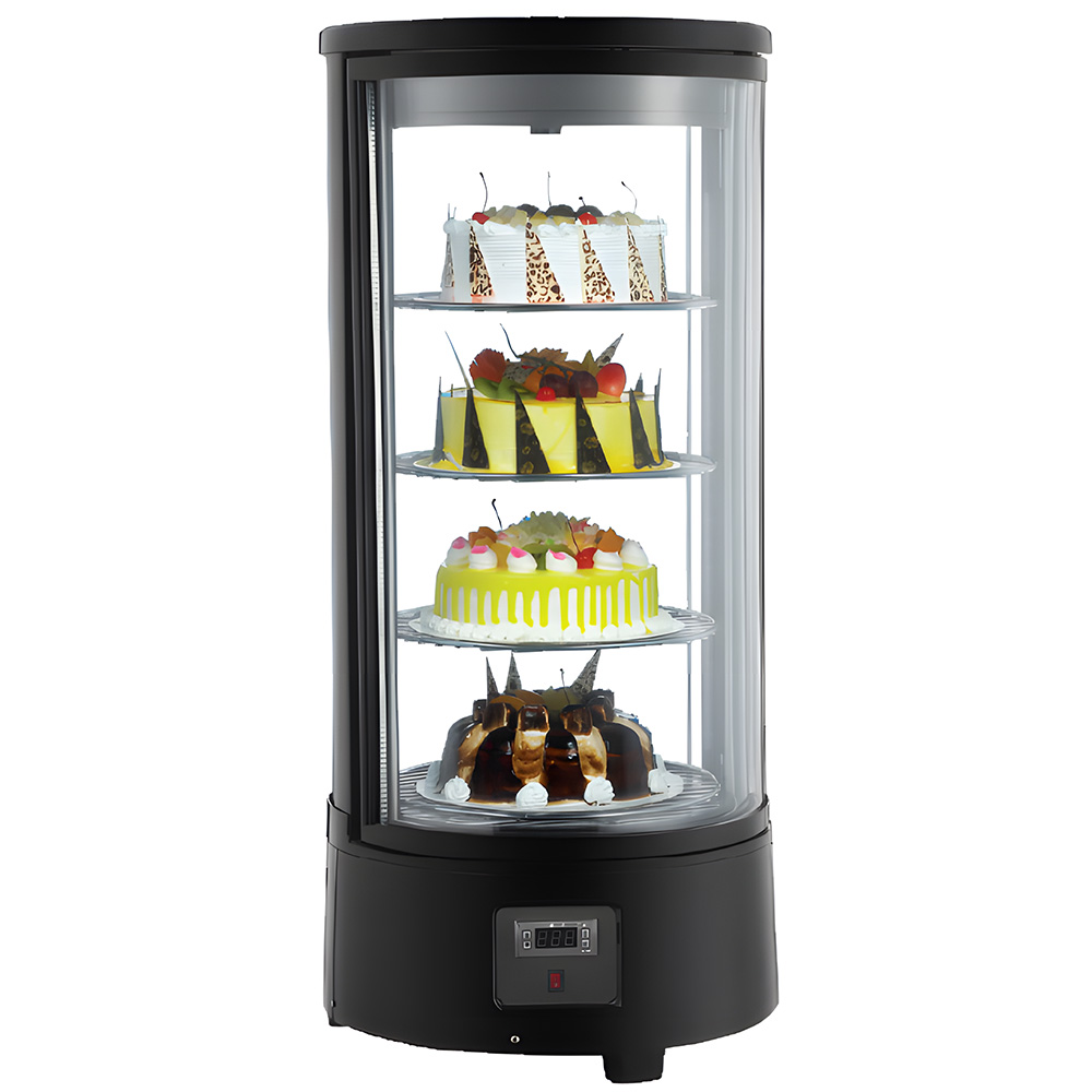 - Вращающиеся полки для максимальной обзорности: Четыре круглые полки диаметром 30 см вращаются, обеспечивая полный обзор каждого изделия. Это особенно эффектно для десертов, пирожных и капкейков.