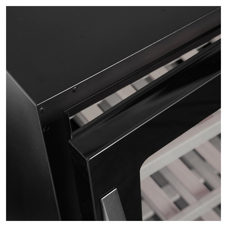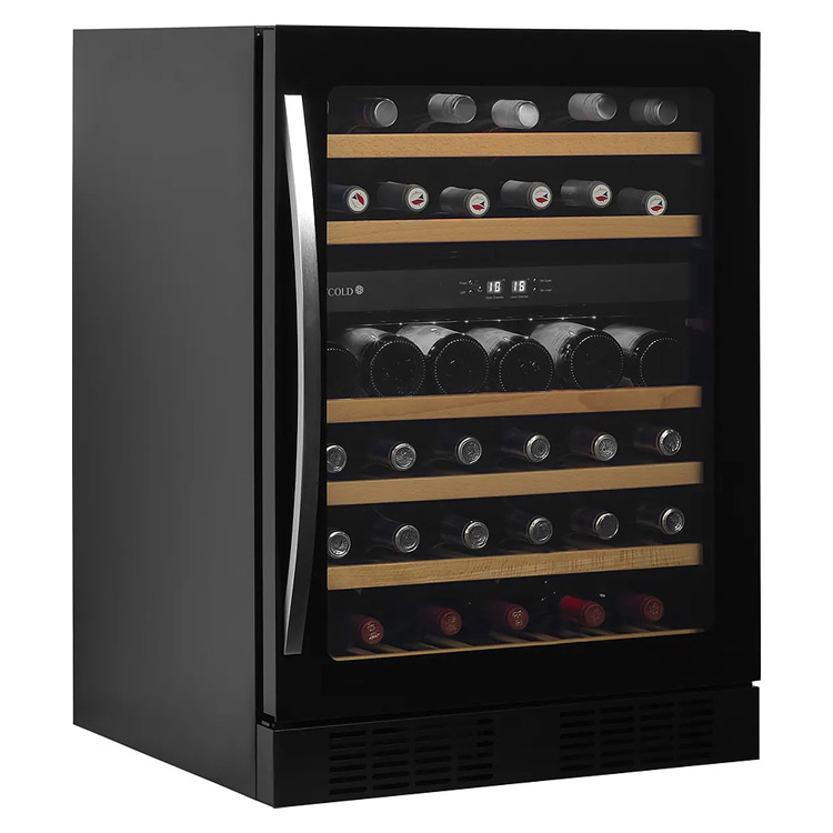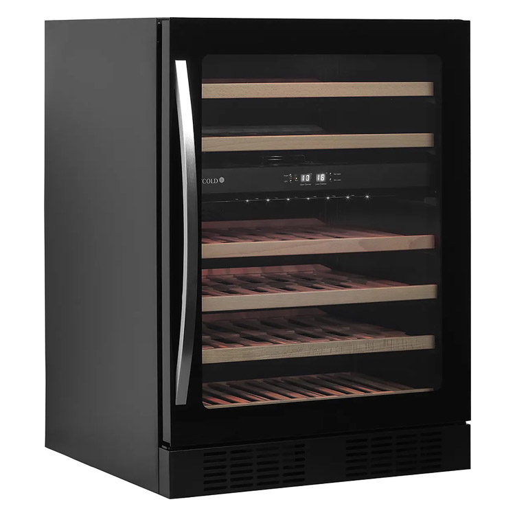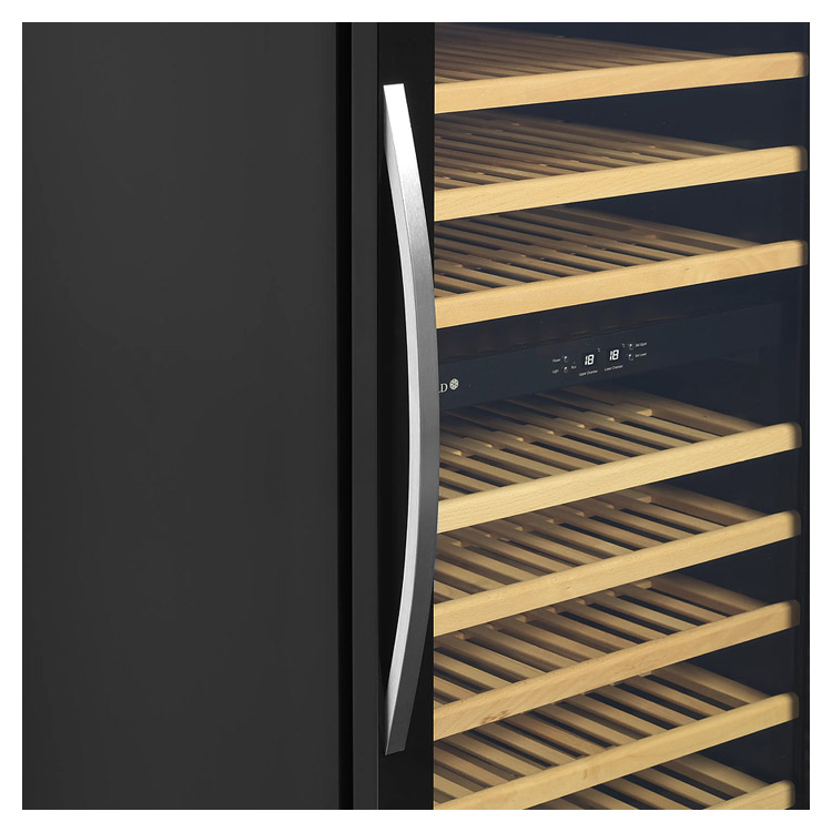 Корпус винного холодильного шкафа чёрного цвета, безрамная стеклянная дверца и ручка из нержавеющей стали. Благодаря дверце из прозрачного стекла, чёрной внутренней поверхности и светодиодному освещению шкаф выглядит свежо и современно. Выдвижные деревянные полки не только красивы, но и удобны в использовании.