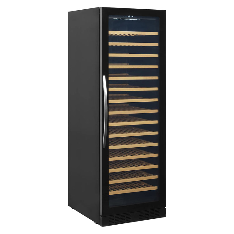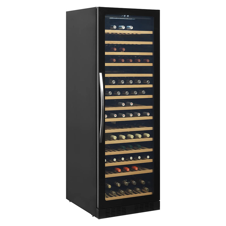 Корпус винного холодильного шкафа чёрного цвета, внутренняя отделка из ABS-пластика чёрного цвета. Шкаф оснащён безрамной стеклянной дверцей с ручкой из нержавеющей стали. Благодаря дверце из прозрачного стекла, чёрной внутренней поверхности и светодиодному освещению шкаф выглядит свежо и современно. Выдвижные деревянные полки не только красивы, но и удобны в использовании.