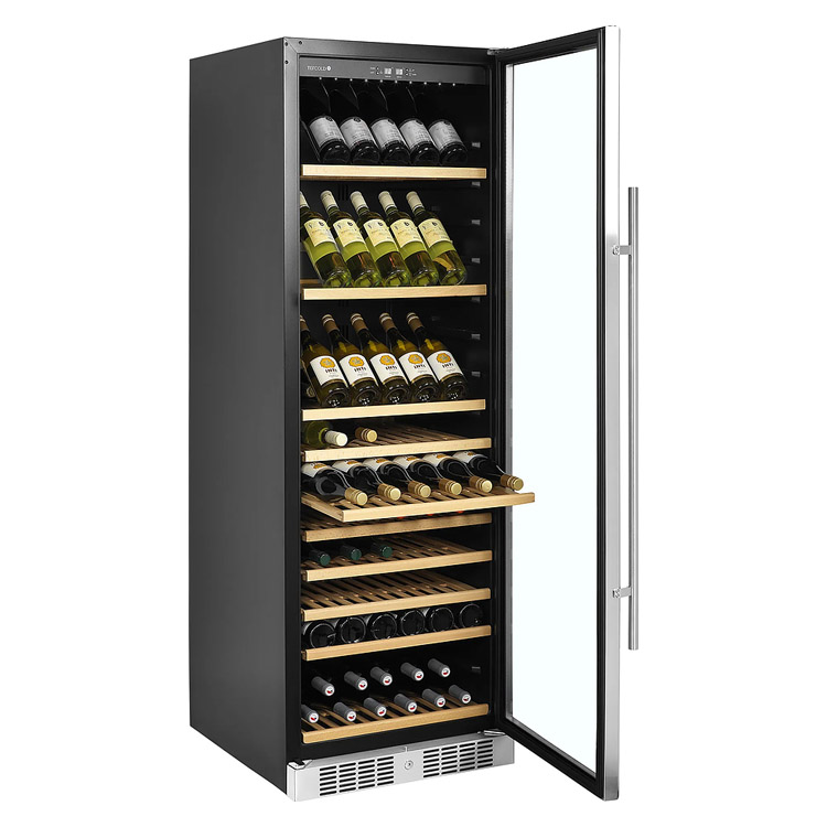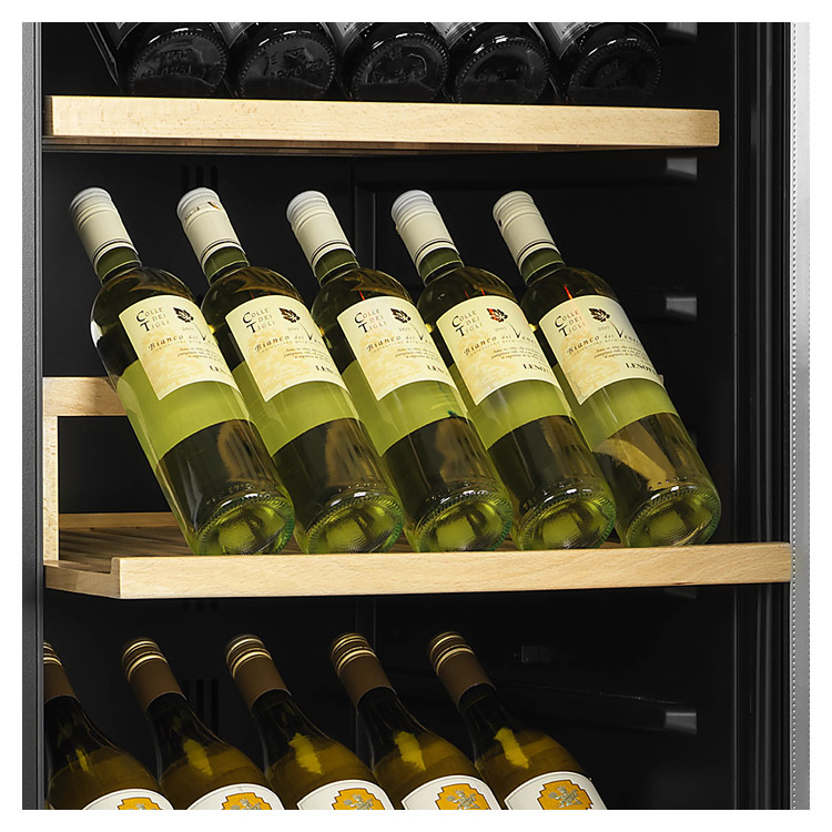 Корпус винного холодильного шкафа чёрного цвета, внутренняя отделка из ABS-пластика чёрного цвета. Шкаф оснащён стеклянной дверцей с рамой и ручкой из нержавеющей стали. Благодаря дверце из прозрачного стекла, чёрной внутренней поверхности и светодиодному освещению шкаф выглядит свежо и современно. Выдвижные деревянные полки не только красивы, но и удобны в использовании.